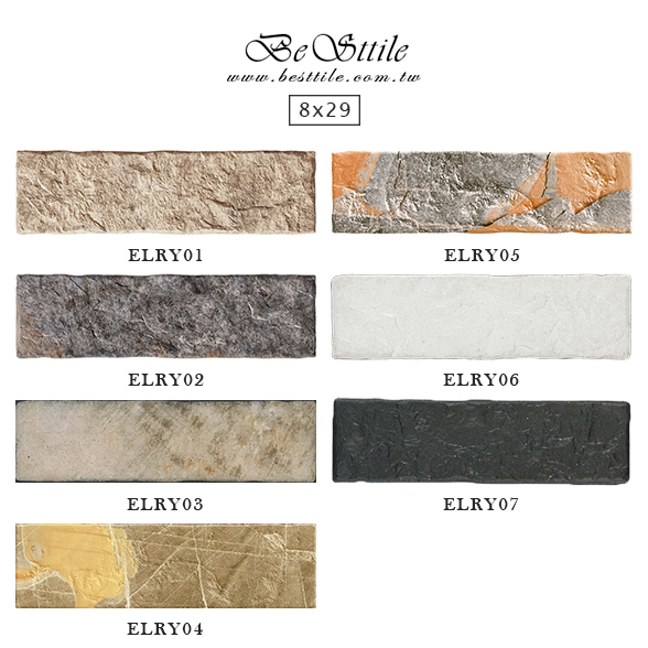 ELRY01 - 沙漠米 ELRY05 - 率性灰 ELRY02 - 風蝕灰 ELRY06 - 流雲白 ELRY03 - 鏽蝕黃 ELRY07 - 靜謐黑 ELRY04 - 沙塵黃 ▲電視牆,文化石,外牆磚,復古磚,工業風,二丁掛磁磚,老屋整建,外牆拉皮,防水,主牆。
