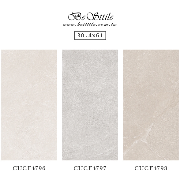 【30.4x61】 CUGF4796 - 霞光白 CUGF4797 - 風沙灰 CUGF4798 - 曙光米 【122.2x122.2】 CUGF23136 - 霞光白 ▲板岩磚的紋路自然變化,耐磨而且容易養護,具有止滑的效果,其材質多為石英材質,堅硬耐用。
