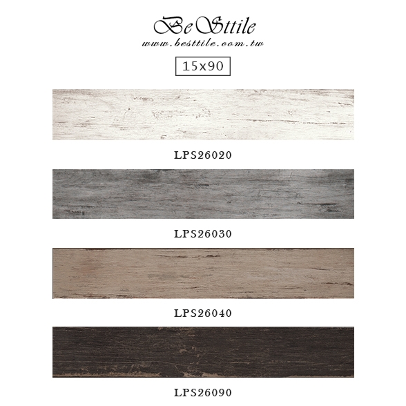 LPS26020 - 樺木白 LPS26030 - 朽木灰 LPS26040 - 橡木棕 LPS26090 - 櫻桃木 ▲木紋磁磚,抗潑水、超耐磨、抗污,耐刮又好清理,年輪木紋,時尚現代磚、室內牆磚、Loft工業風,木紋地板磚、南方松木地板磚