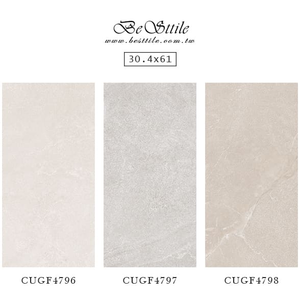 【30.4x61】 CUGF4796 - 霞光白 CUGF4797 - 風沙灰 CUGF4798 - 曙光米 【122.2x122.2】 CUGF23136 - 霞光白 ▲板岩磚的紋路自然變化,耐磨而且容易養護,具有止滑的效果,其材質多為石英材質,堅硬耐用。