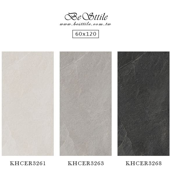 【60x120】 KHCER3261 - 玄色米 KHCER3263 - 太空灰 KHCER3268 - 穆勒黑 【120x120】 KHCER3361 - 玄色米 KHCER3363 - 太空灰 ▲電視牆、主牆、浴室廁所、戶外地板、牆壁、公共空間、客廳、臥房、餐廳、廚房、衛浴、戶外牆、大理石、花崗石、板岩