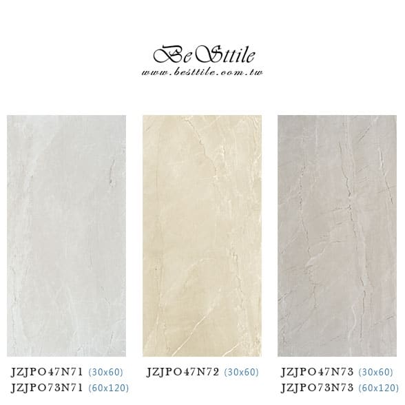 【30x60】 JZJPO47N71 - 河川白 JZJPO47N72 - 夕陽黃 JZJPO47N73 - 城堡灰 【60x120】 JZJPO73N71 - 河川白 JZJPO73N73 - 城堡灰 ▲電視牆、主牆、浴室廁所、戶外地板、牆壁、公共空間、客廳、臥房、餐廳、廚房、衛浴、戶外牆、大理石、花崗石、板岩