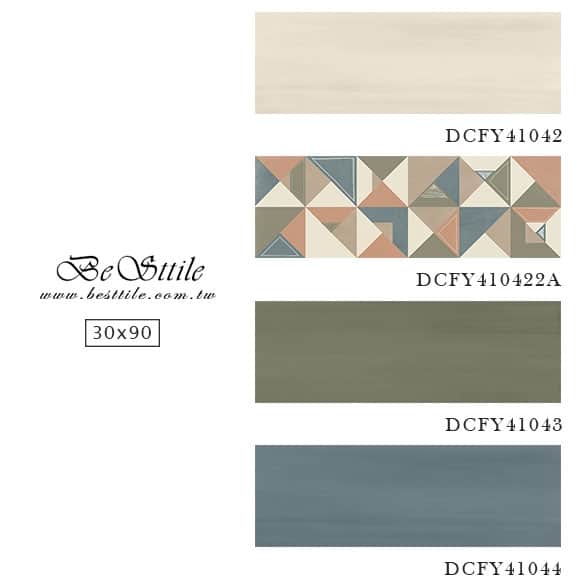 DCFY41042 - 奶油白 DCFY41043 - 抹茶綠 DCFY41044 - 粉彩藍 DCFY410422A -幾何花磚 ▲電視牆、主牆、浴室廁所、戶外地板、牆壁、公共空間、客廳、臥房、餐廳、廚房、衛浴、戶外牆、大理石、花崗石、板岩