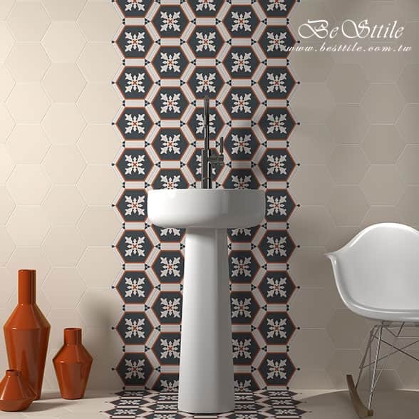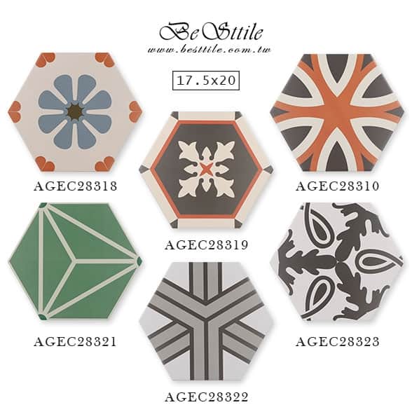 AGEC28318 - 花磚A AGEC28319 - 花磚B AGEC28310 - 花磚C AGEC28321 - 花磚D AGEC28322 - 花磚E AGEC28323 - 花磚F ▲六角磚,幾何、六角、蜂巢,現代風、工業風,咖啡廳、特殊造型磚、花磚