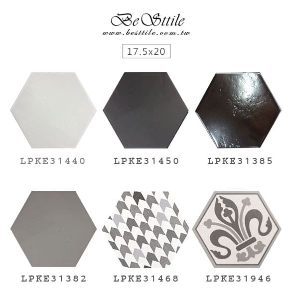 LPKE31440 - 雲朵白(霧面) LPKE31450 - 迷霧灰(霧面) LPKE31385 - 窯變金屬(霧面) LPKE31382 - 奶茶棕(霧面) LPKE31468 - 格子花磚(霧面-款式隨機) LPKE31946 - 灰色花磚(霧面-款式隨機) ▲六角磚,幾何、六角、蜂巢,現代風、工業風,咖啡廳、特殊造型磚、花磚